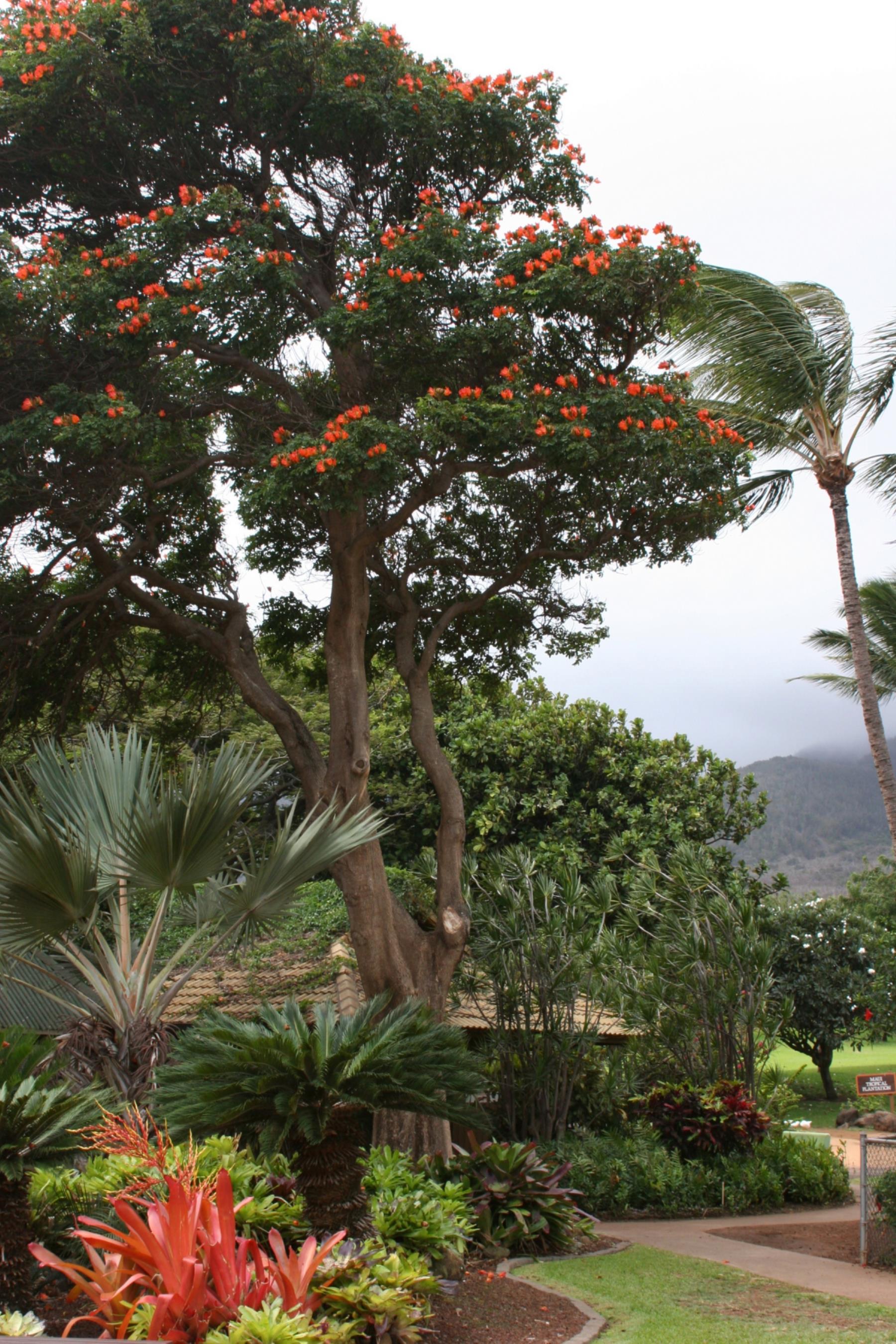 flowering tree; red flowers; red; flower; maui tropical plantation; maui; hawaii; flowers