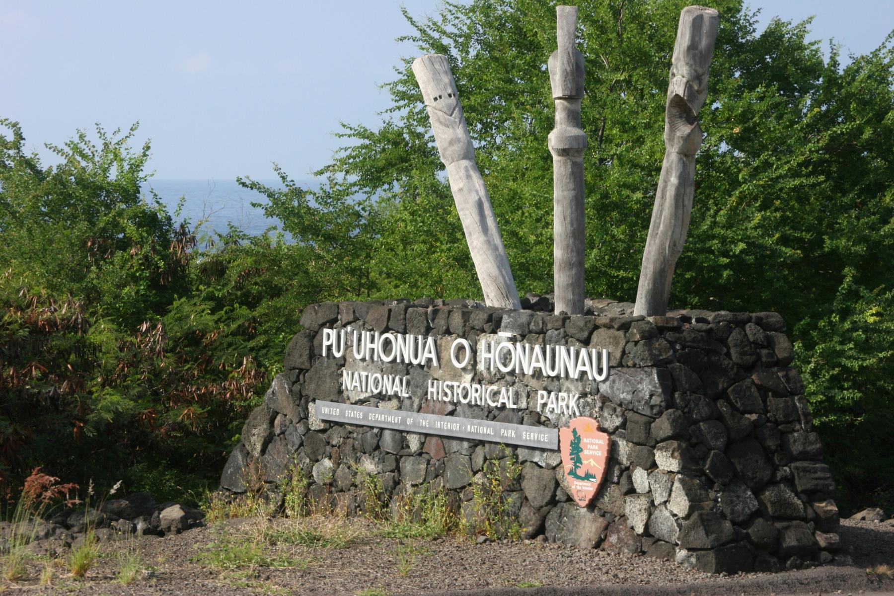 Entrance sign, Pu'uhonua O Honaunau National Historical Park, near Kona, Island of Hawaii, Hawaii.