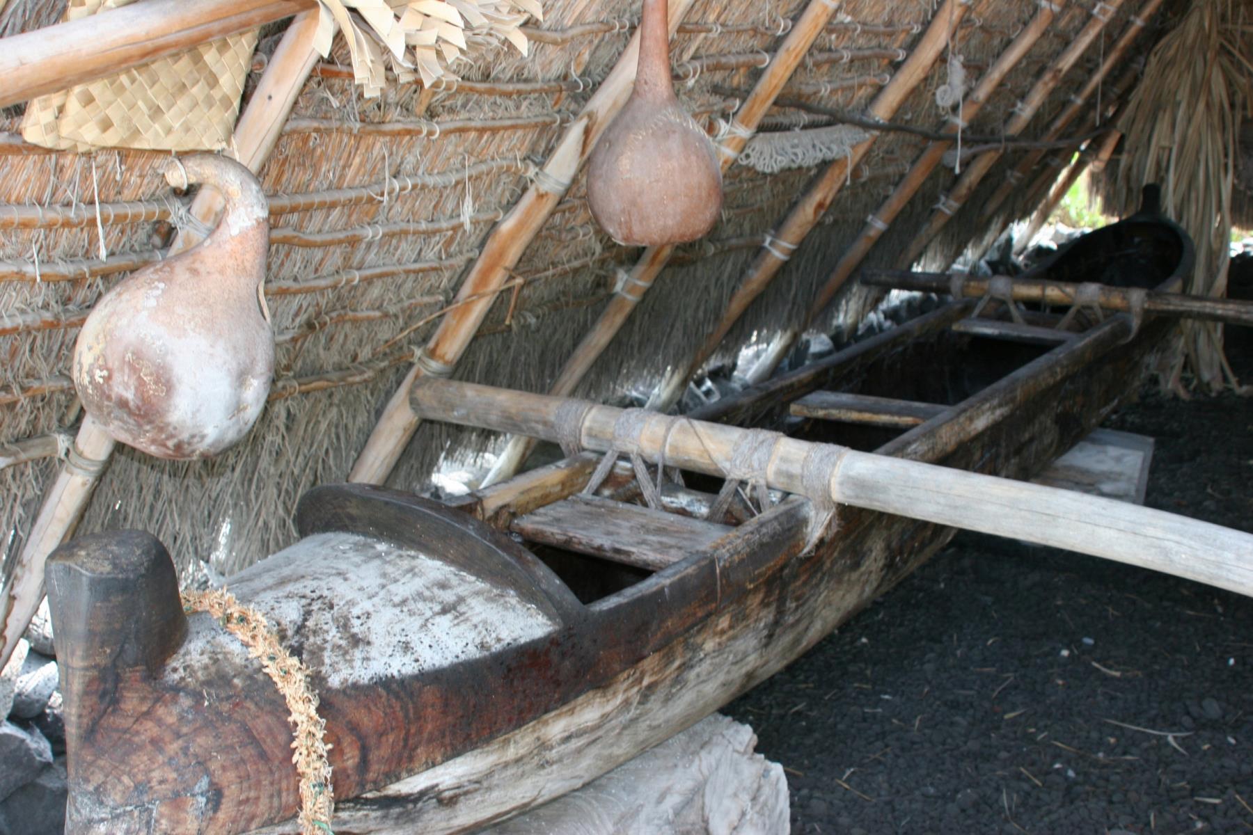 Primitive boat in thatched roof hut, Pu'uhonua O Honaunau National Historical Park, near Kona, Island of Hawaii, Hawaii.