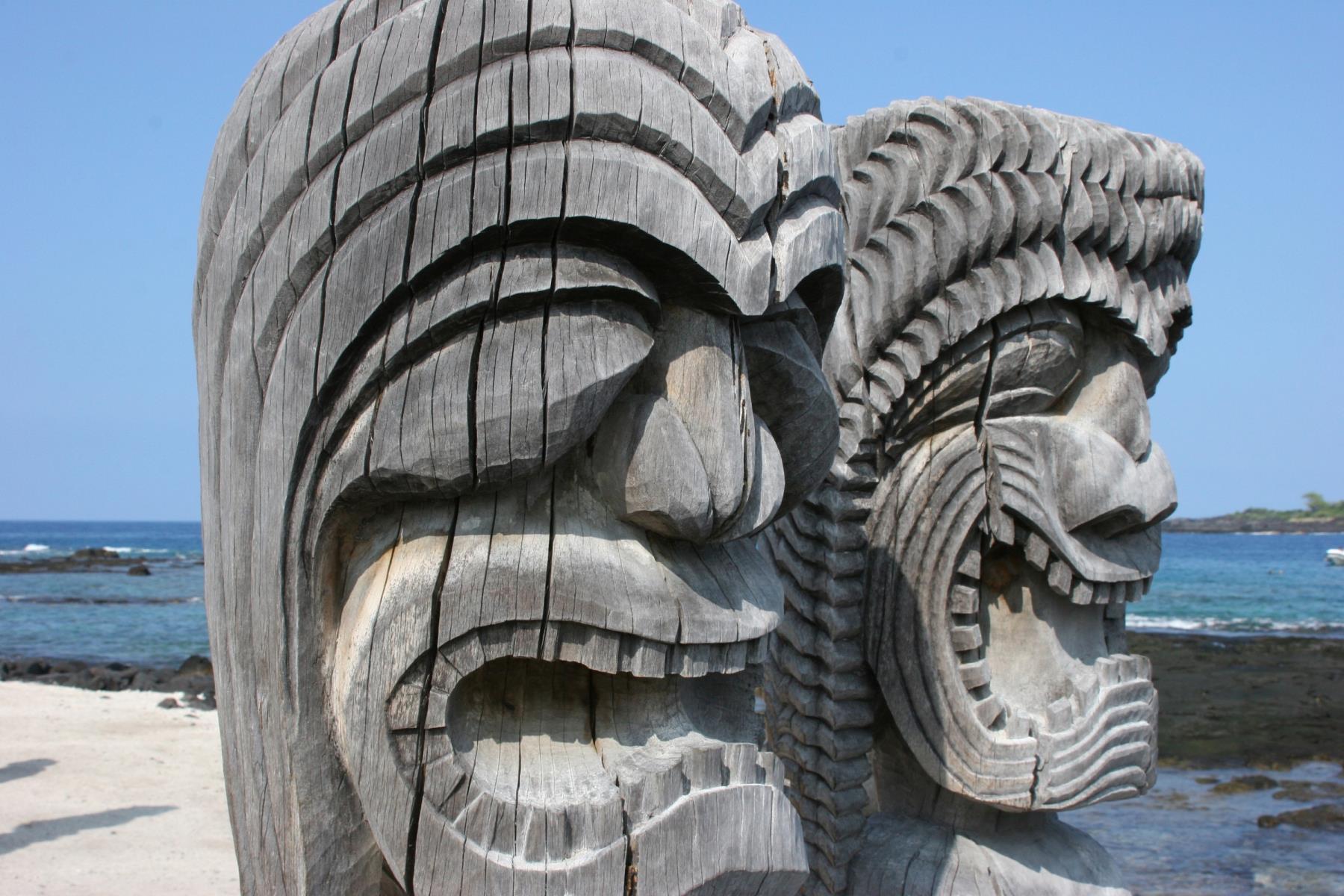 wooden statues; statues; pagan gods; ki'i; pu'uhonua o honaunau national historical park; kona; island of hawaii; hawaii