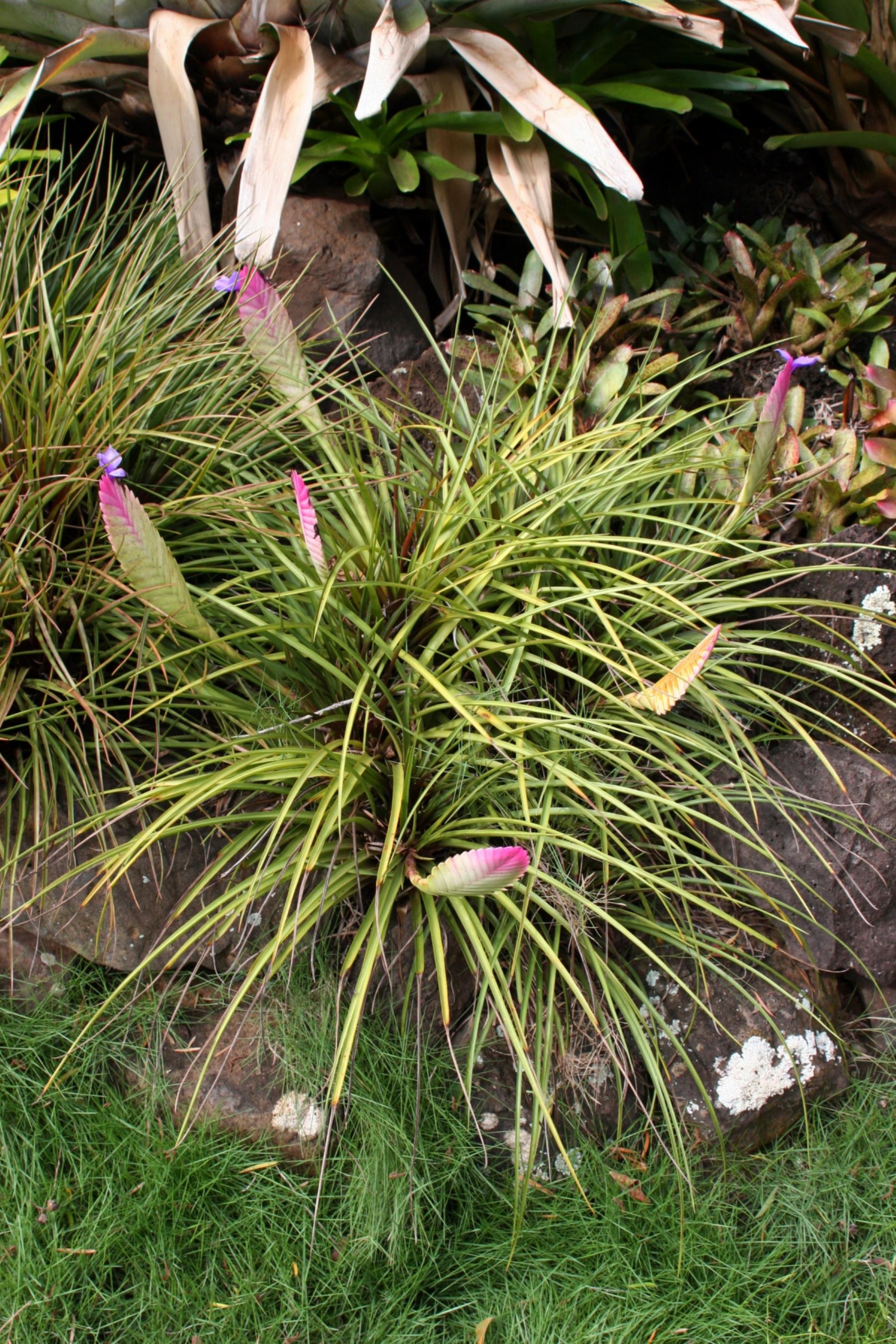 Painted feather, bromeliad flower; red flowers, Allerton Garden or Kuai National Botanical Garden, Kuai, Hawaii.