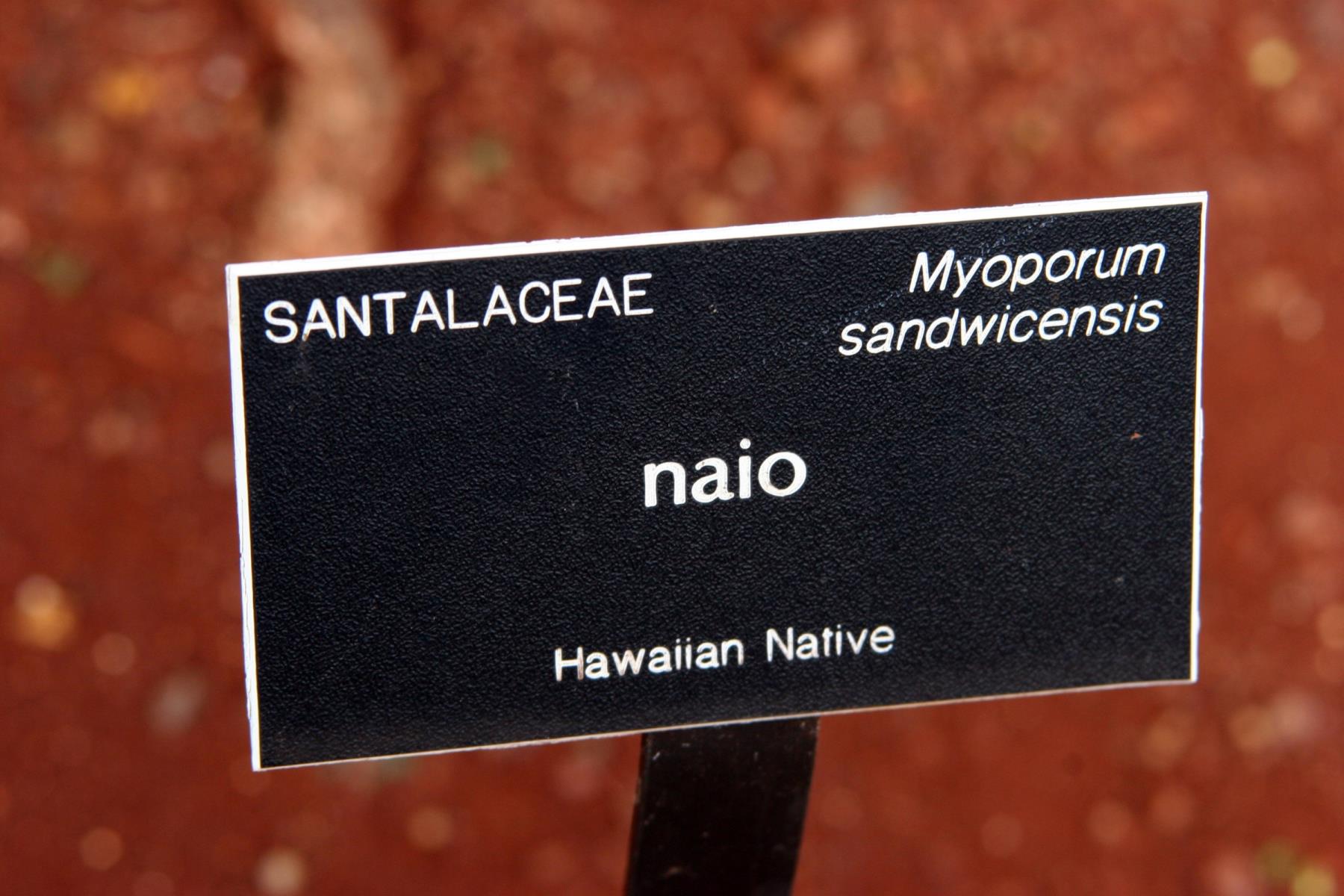 Sign for the plant naio, Allerton Garden or Kuai National Botanical Garden, Kuai, Hawaii.