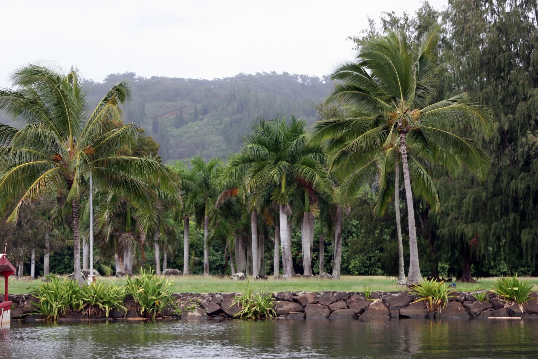 Coconut palm trees along Wailua River, Kuai, Hawaii