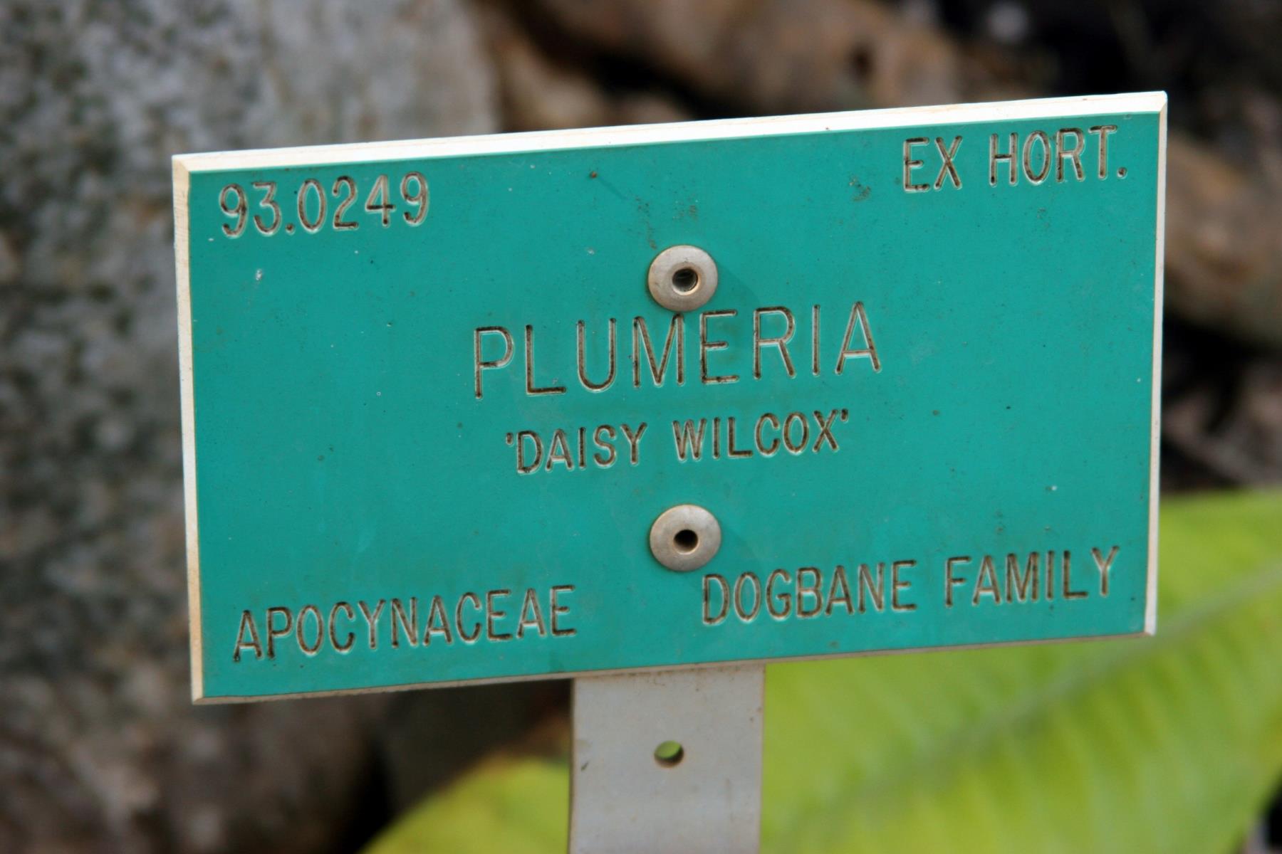 Plumeria flower sign, KoKo Crater Botanical Gardens, near Honolulu, O'ahu, Hawaii.