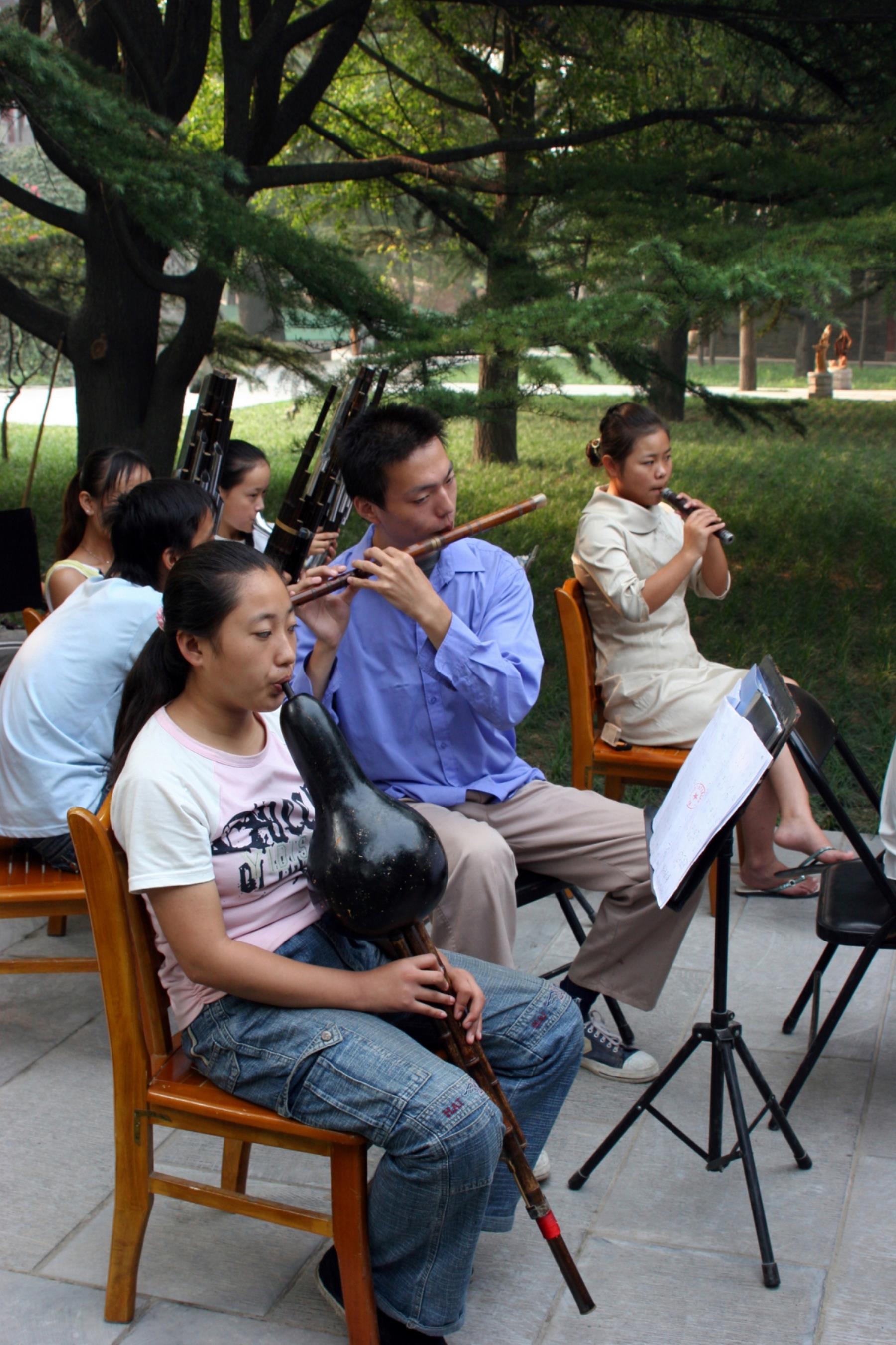 chinese music students; music; musical; music instruments; small wild goose pagoda; xian; china