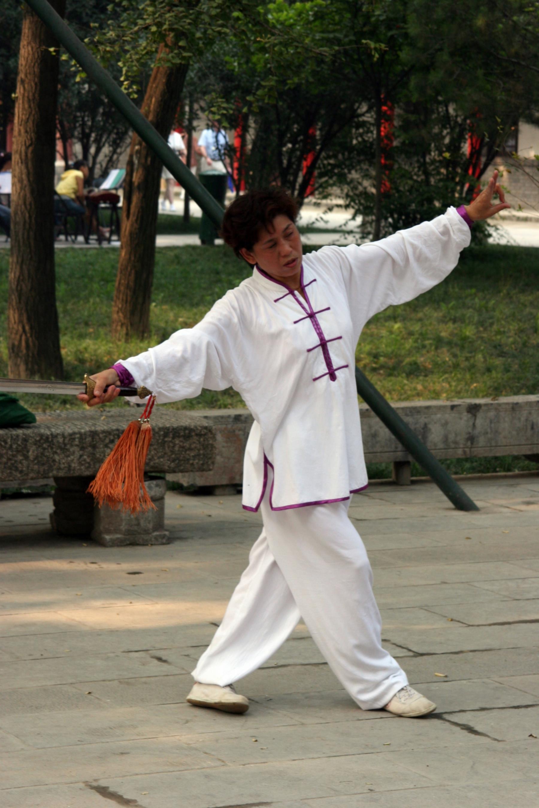 woman performing martial arts; martial arts; exercise; exercising; exercised; small wild goose pagoda; xian; china; exercises