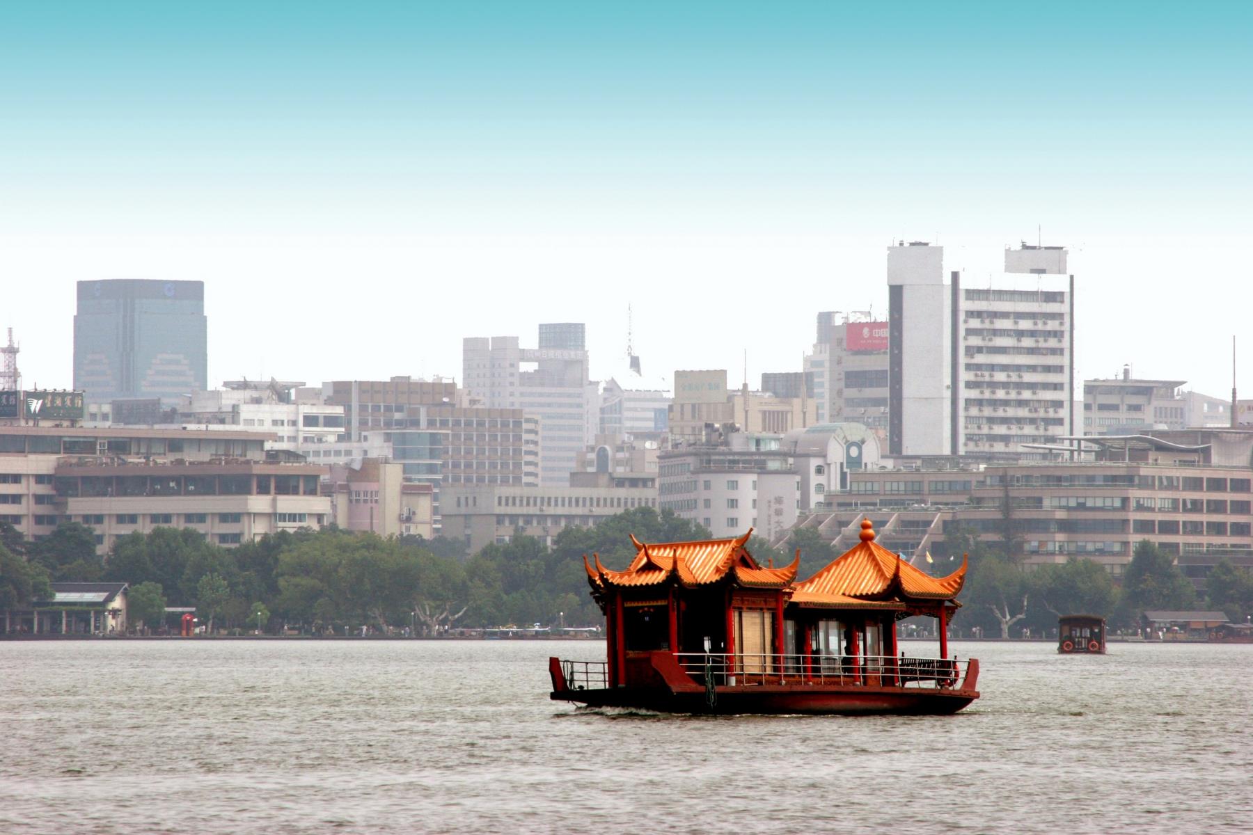Chinese boat and Hangzhou buildings, West Lake, Hangzhou, China
