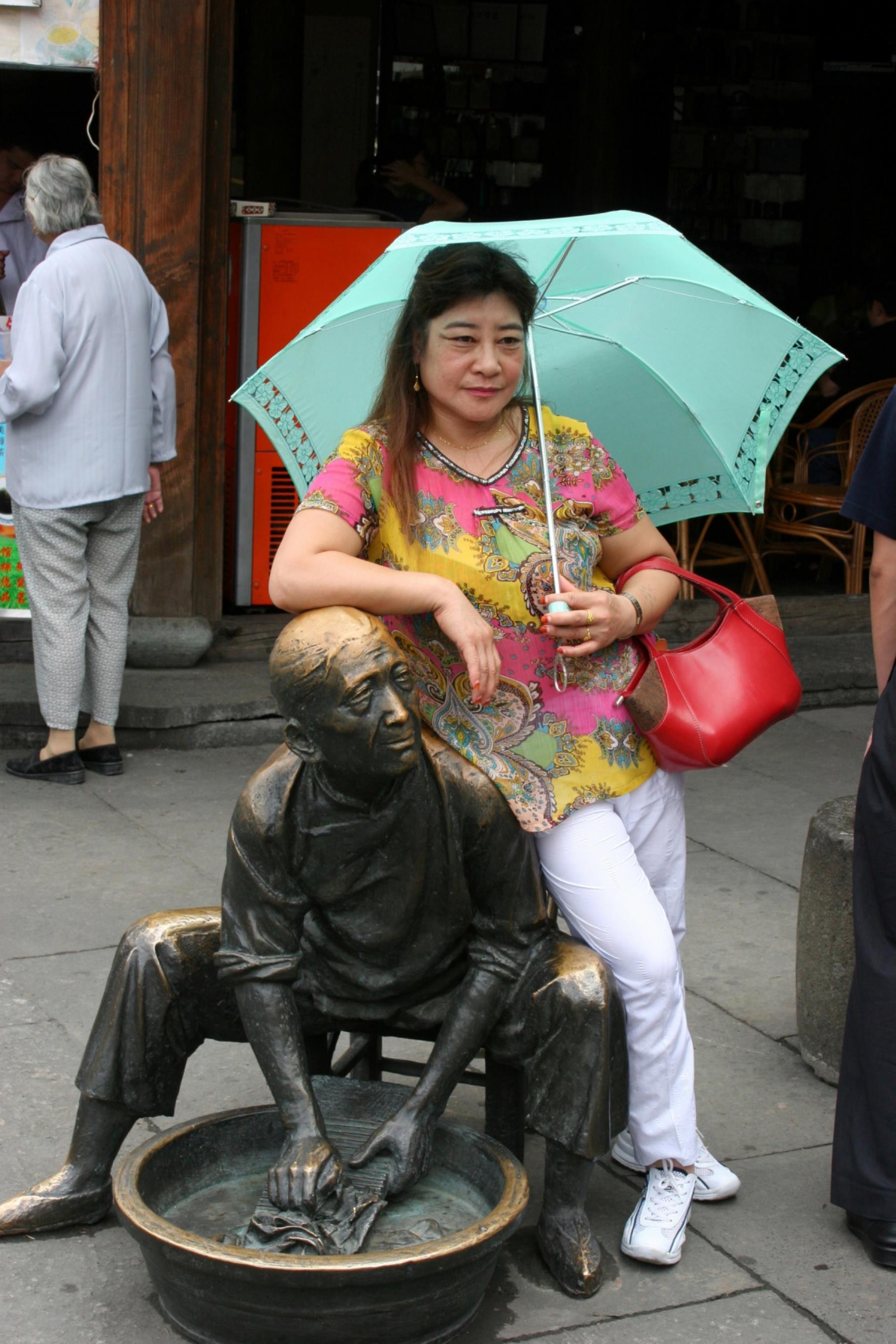 Chinese woman leaning on statue of a man with washtub, Hangzhou, China.