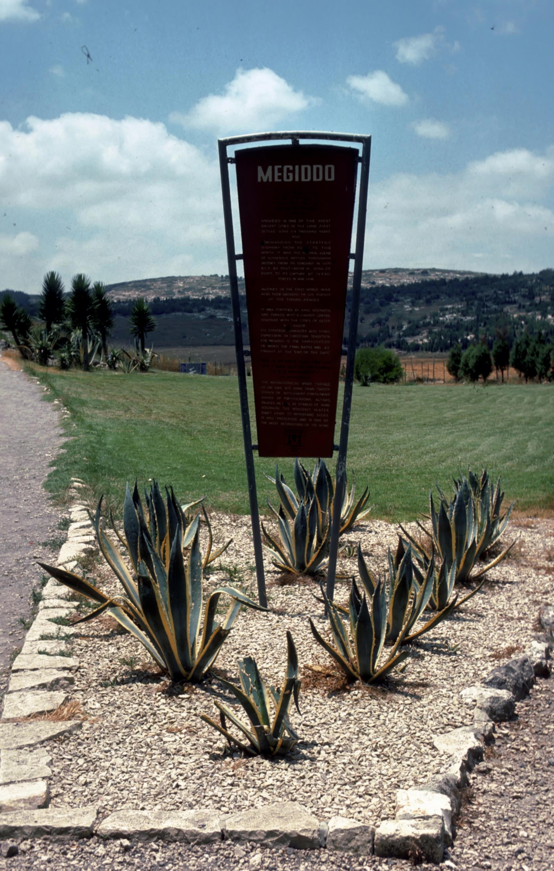 Megiddo, Tell El Mutesellim, is in the Plain of Esdraelon, often thought to be the Armageddon of Revelation 16:16. Megiddo guarded the caravan route from Gaza in the south to Damascus in the north, strategic for the movement of goods and armies. Near here, Deborah and Barak won a great battle (Judges 5:19, 20), Gideon defeated the Midianites (Judges 6:33), and Saul died in battle (1 Samuel 31). Today Megiddo is only a tell, ruins of many periods of history in different layers. It was excavated by the Oriental Institute of Chicago, starting in 1925. Sign identifying Megiddo.