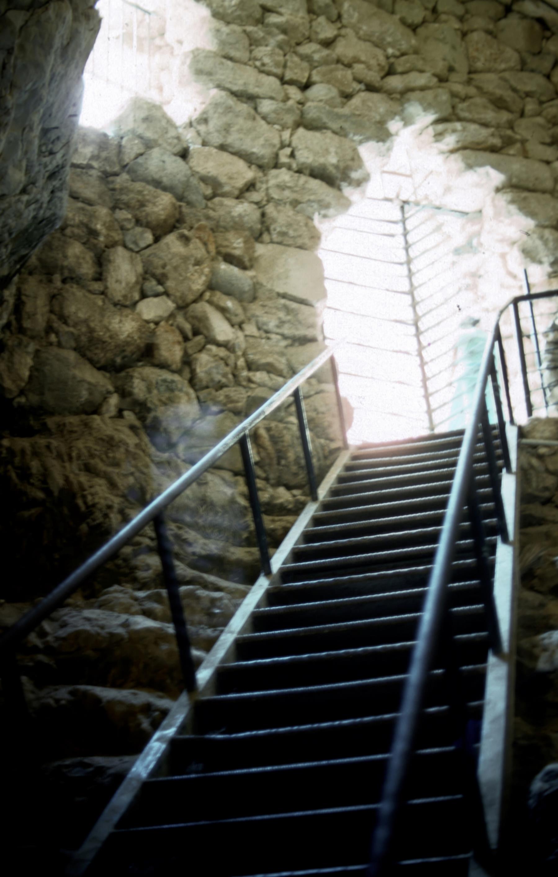 Megiddo, Tell El Mutesellim, is in the Plain of Esdraelon, often thought to be the Armageddon of Revelation 16:16. Megiddo guarded the caravan route from Gaza in the south to Damascus in the north, strategic for the movement of goods and armies. Near here, Deborah and Barak won a great battle (Judges 5:19, 20), Gideon defeated the Midianites (Judges 6:33), and Saul died in battle (1 Samuel 31). Today Megiddo is only a tell, ruins of many periods of history in different layers. It was excavated by the Oriental Institute of Chicago, starting in 1925. City water system, 9th century B. C.