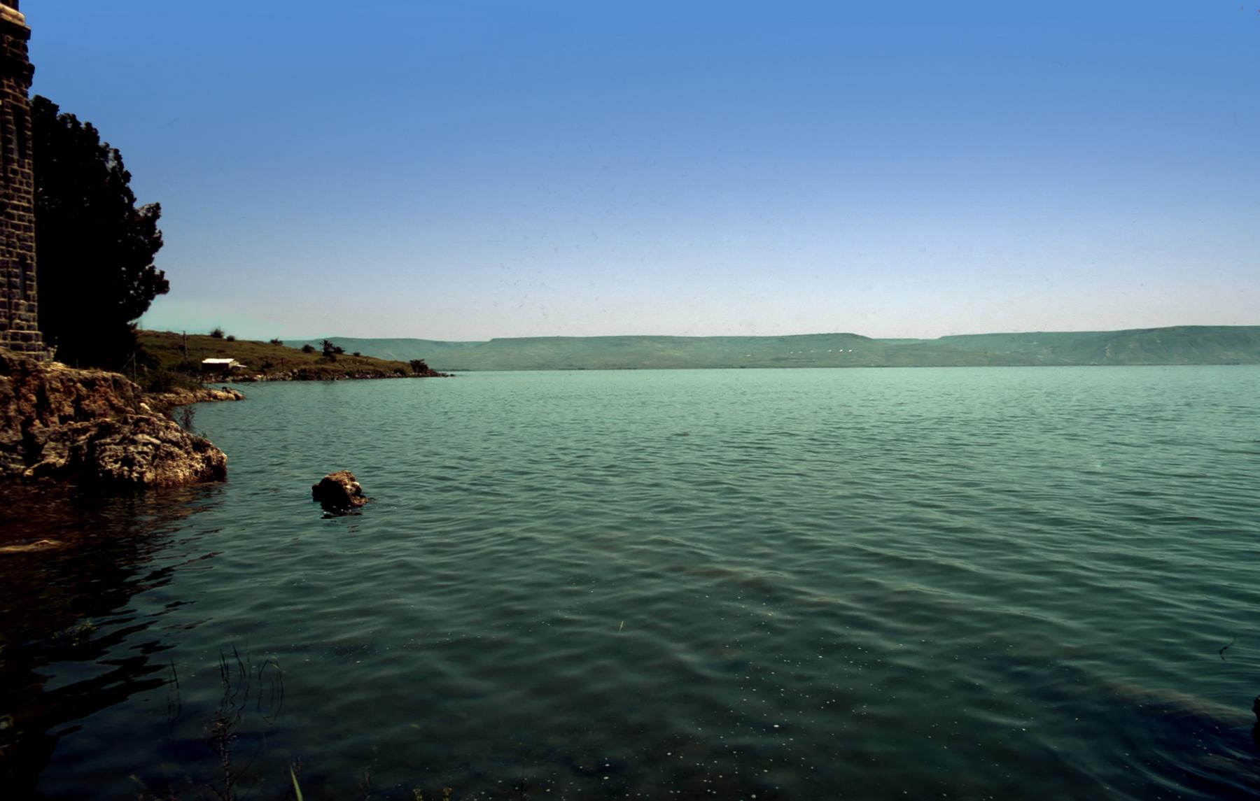 The Sea of Galilee, one of the most beautiful lakes in the world, was a focal point of much of Jesus' ministry. Of his 33 recorded miracles, at least 18 happened here. The sea is a large lake, with its surface 600 feet below sea level. The Jordan River flows into the north of the lake and exists at the south end. Fishing was the main industry during Jesus' time. The lake has had at least a dozen names, including the Lake of Gennesaret (Luke 5:1), the Sea of Chinnereth (Numbers 34:11), and Lake Tiberias. St. Peter's Church, a Franciscan church, was built on the shore of the Sea of Galilee in memory of the first miracle of fish. Looking east from the church.