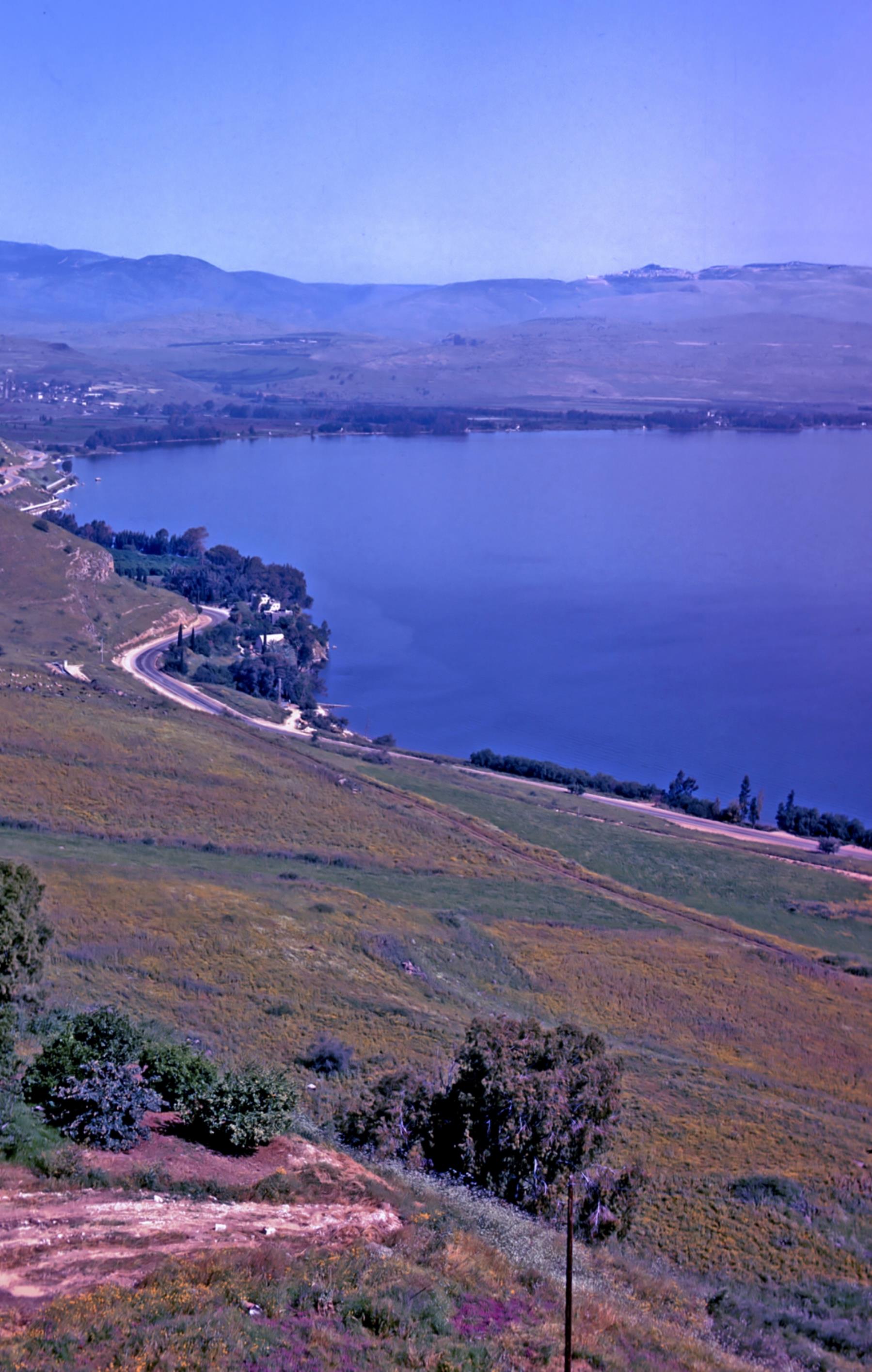 The Sea of Galilee, one of the most beautiful lakes in the world, was a focal point of much of Jesus' ministry. Of his 33 recorded miracles, at least 18 happened here. The sea is a large lake, with its surface 600 feet below sea level. The Jordan River flows into the north of the lake and exists at the south end. Fishing was the main industry during Jesus' time. The lake has had at least a dozen names, including the Lake of Gennesaret (Luke 5:1), the Sea of Chinnereth (Numbers 34:11), and Lake Tiberias. Looking west from Tiberias.