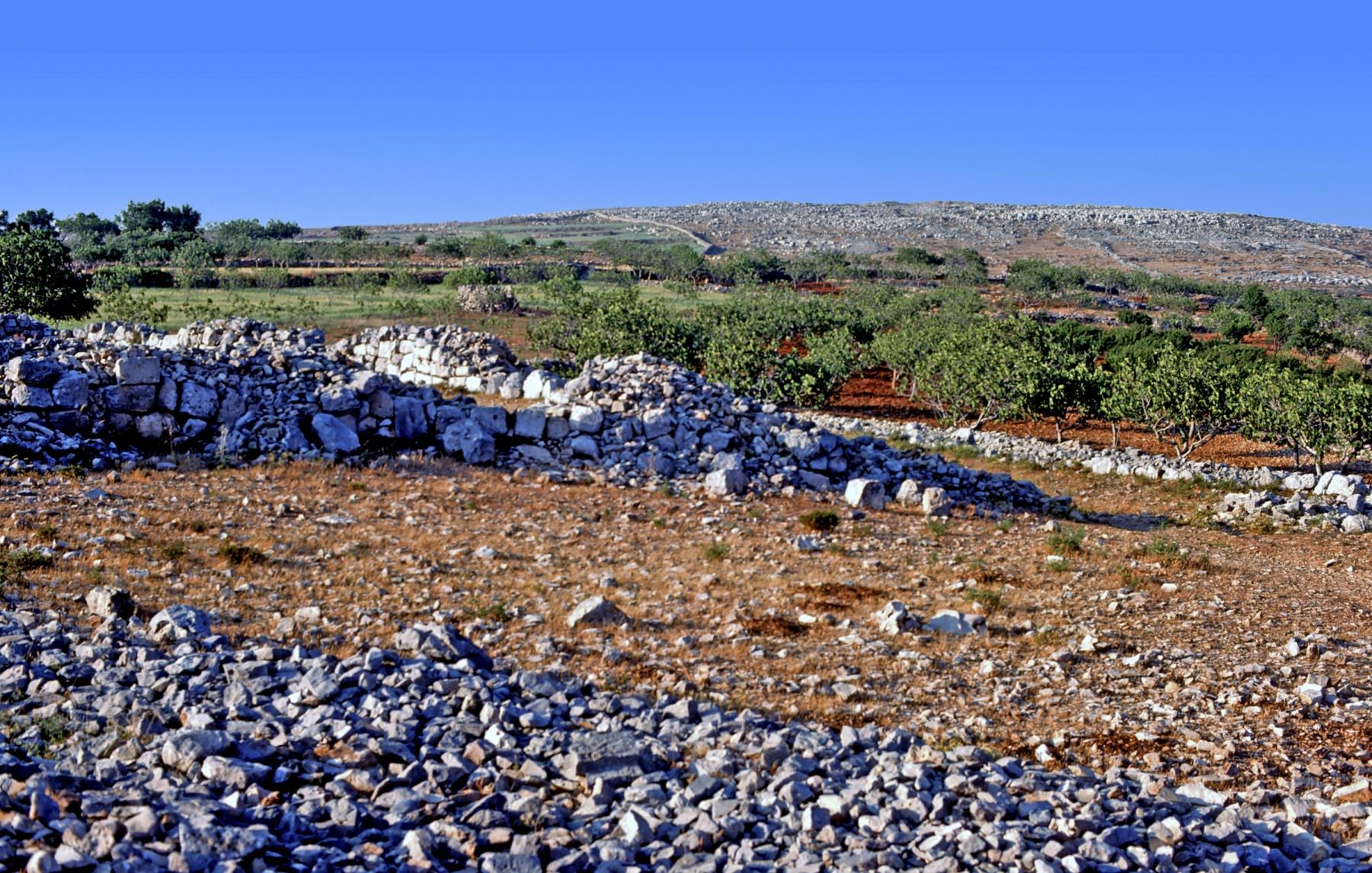 Twelve miles northwest of Jerusalem, on the border of Samaria and Judea, is a little Arab village named Beitin, sometimes called Beit El. Nearby is the site of ancient Bethel. Here Jacob stopped for the night enroute to Haran and dreamed of angels ascending and descending on a ladder, or stairway, to heaven. There is a British tradition that the stone which served as Jacob's pillow is now under the seat of the Coronation chair in Westminster Abbey. Bethel means house of God. In the distance, in this picture, is the modern Arab village Beitin, near Bible-time Bethel. Looking west from ruins near Bethel.