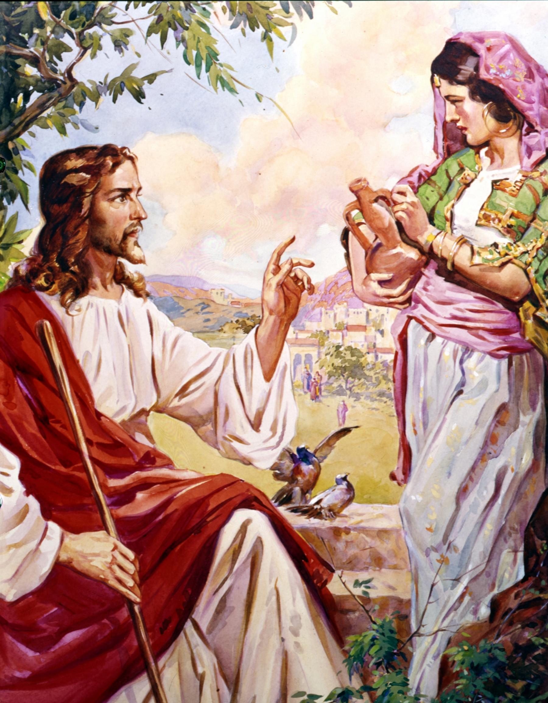 Jesus talks with a Samaritan woman by Jacob's well, near Sychar--