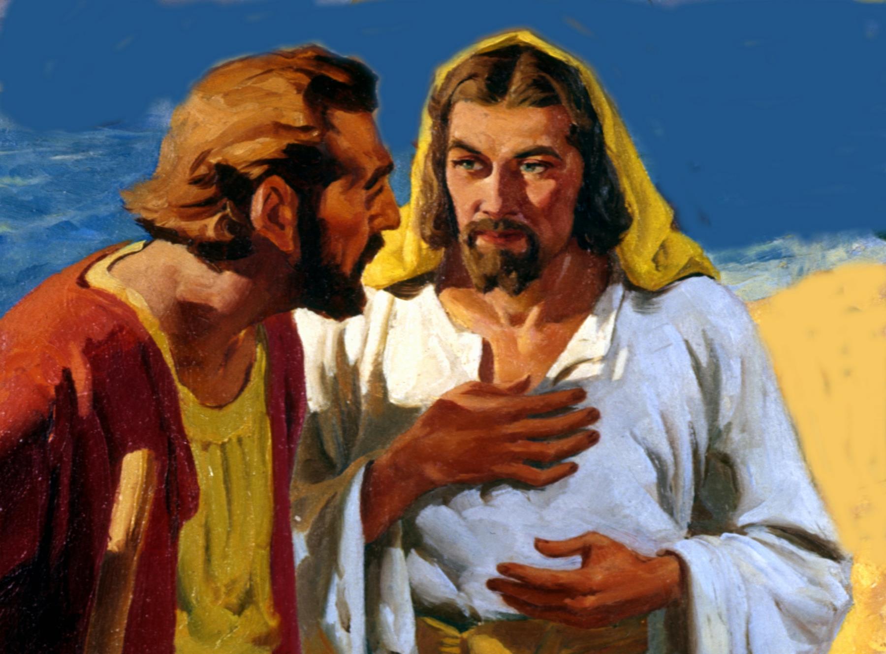 Jesus talks with Peter beside the Sea of Galilee and tells Peter to feed his sheep --
