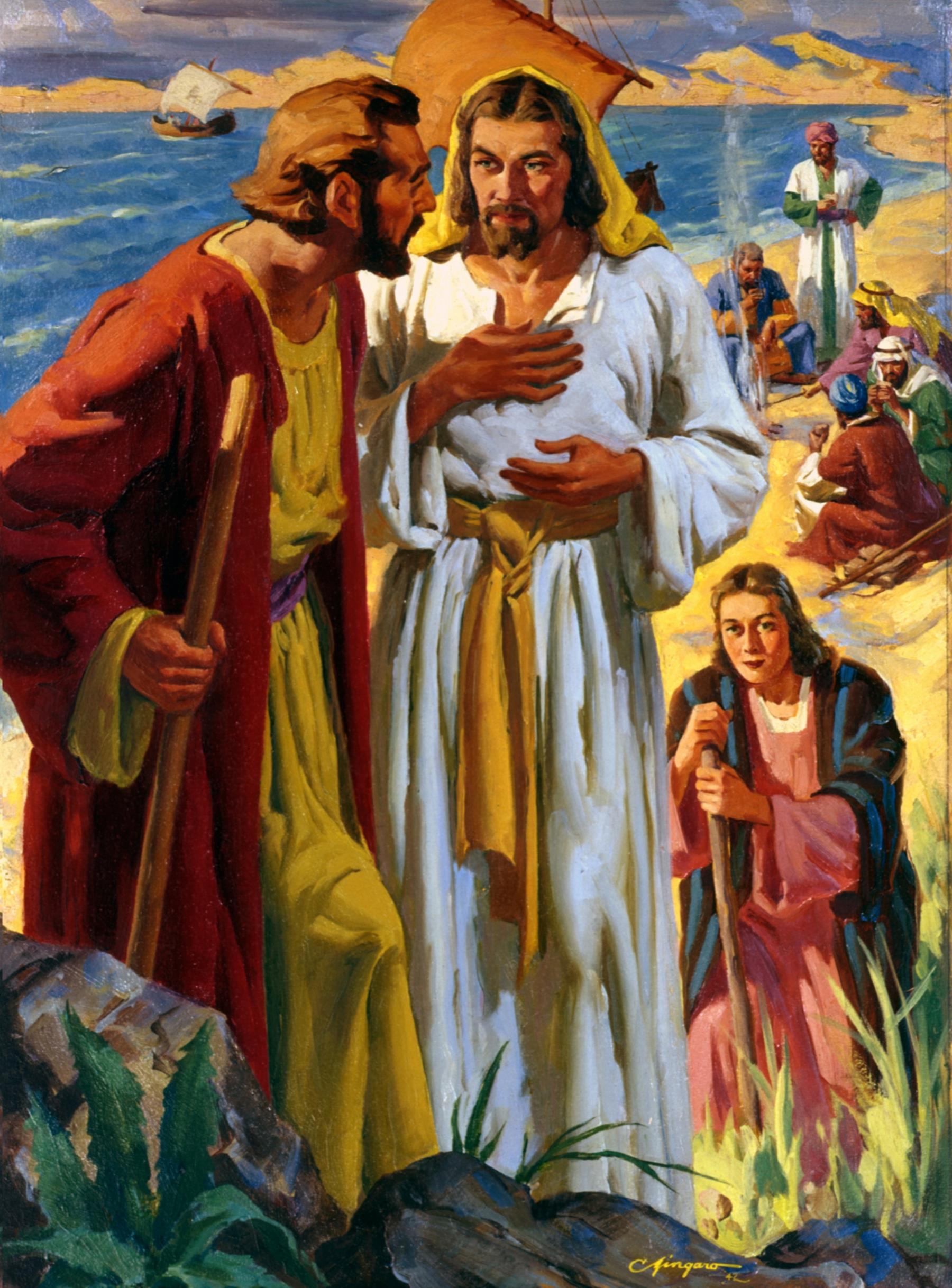 Jesus talks with Peter beside the Sea of Galilee and tells Peter to feed his sheep --
