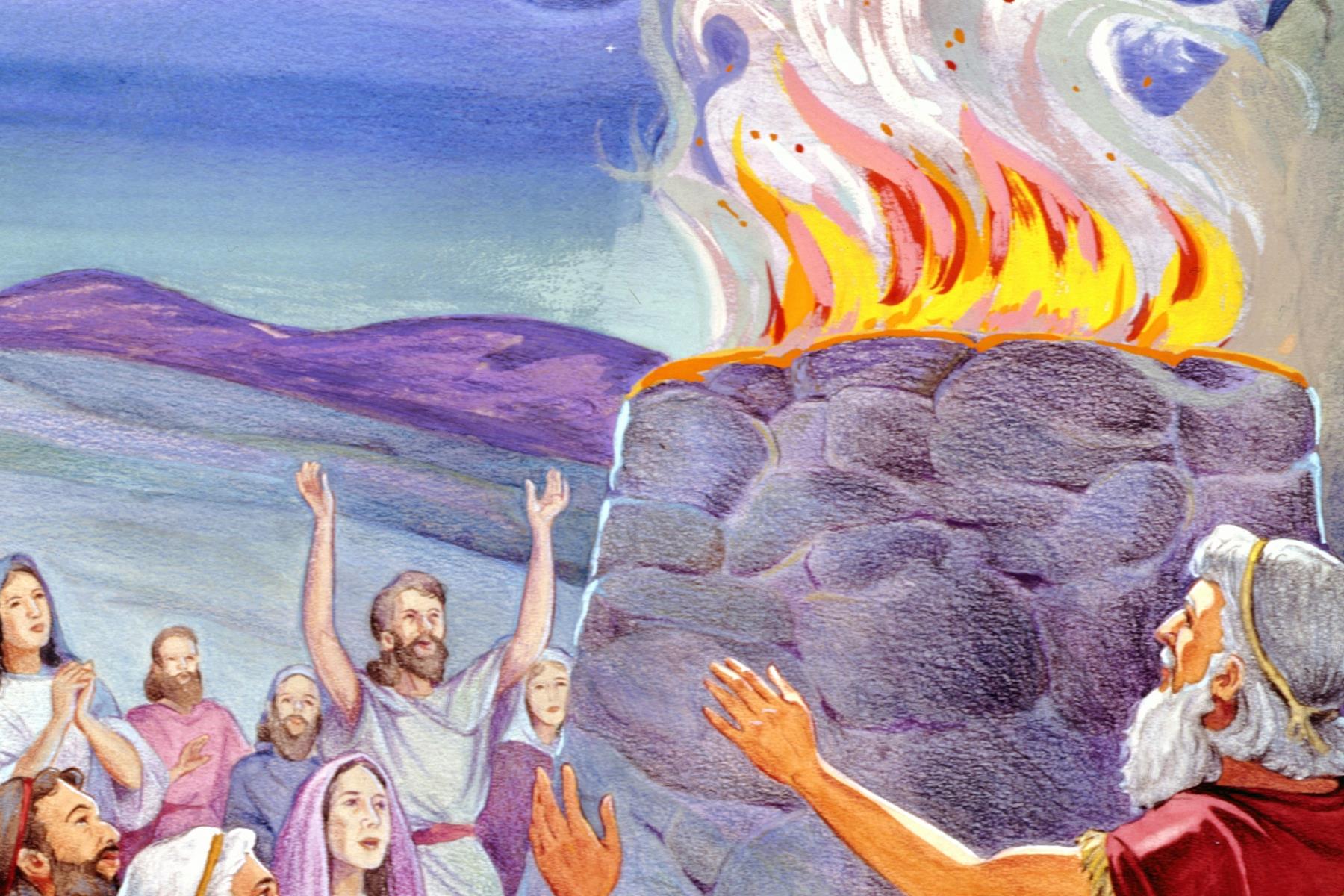The people of Israel make a burnt offering, or sacrifice, to the Lord on a stone altar.