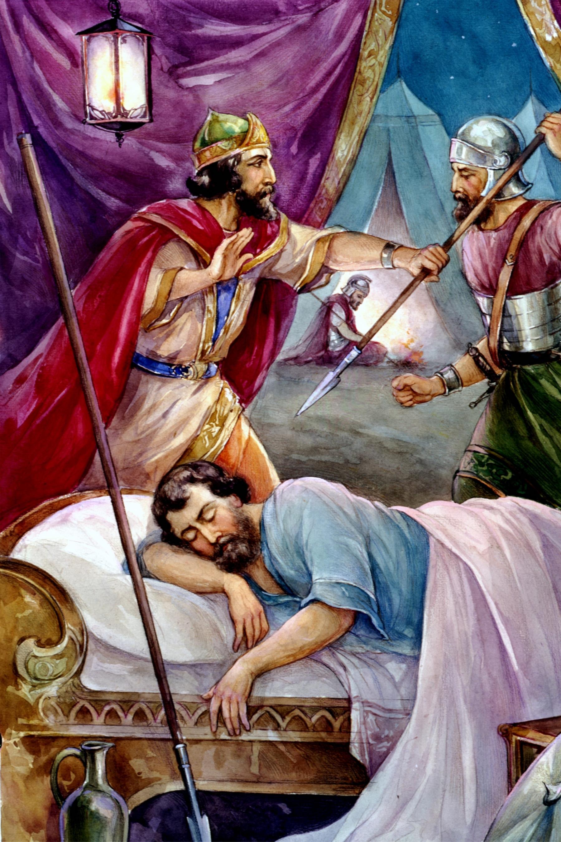 Abishai tries to kill Saul, but David stops him, showing David's kindness -- 1 Samuel 26.