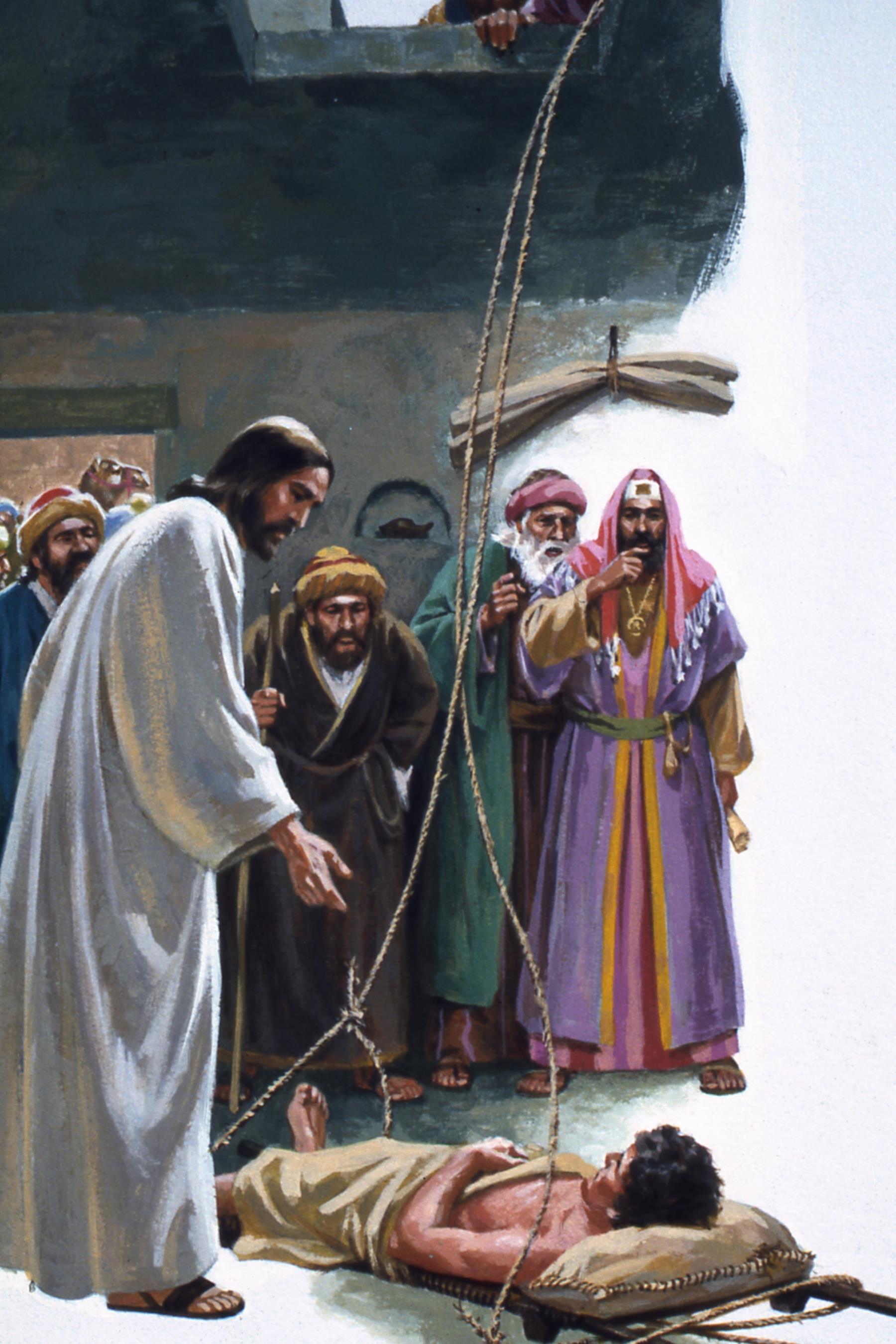 Jesus healed a paralyzed man who was let down through a roof by friends--Mark 2:1-12.