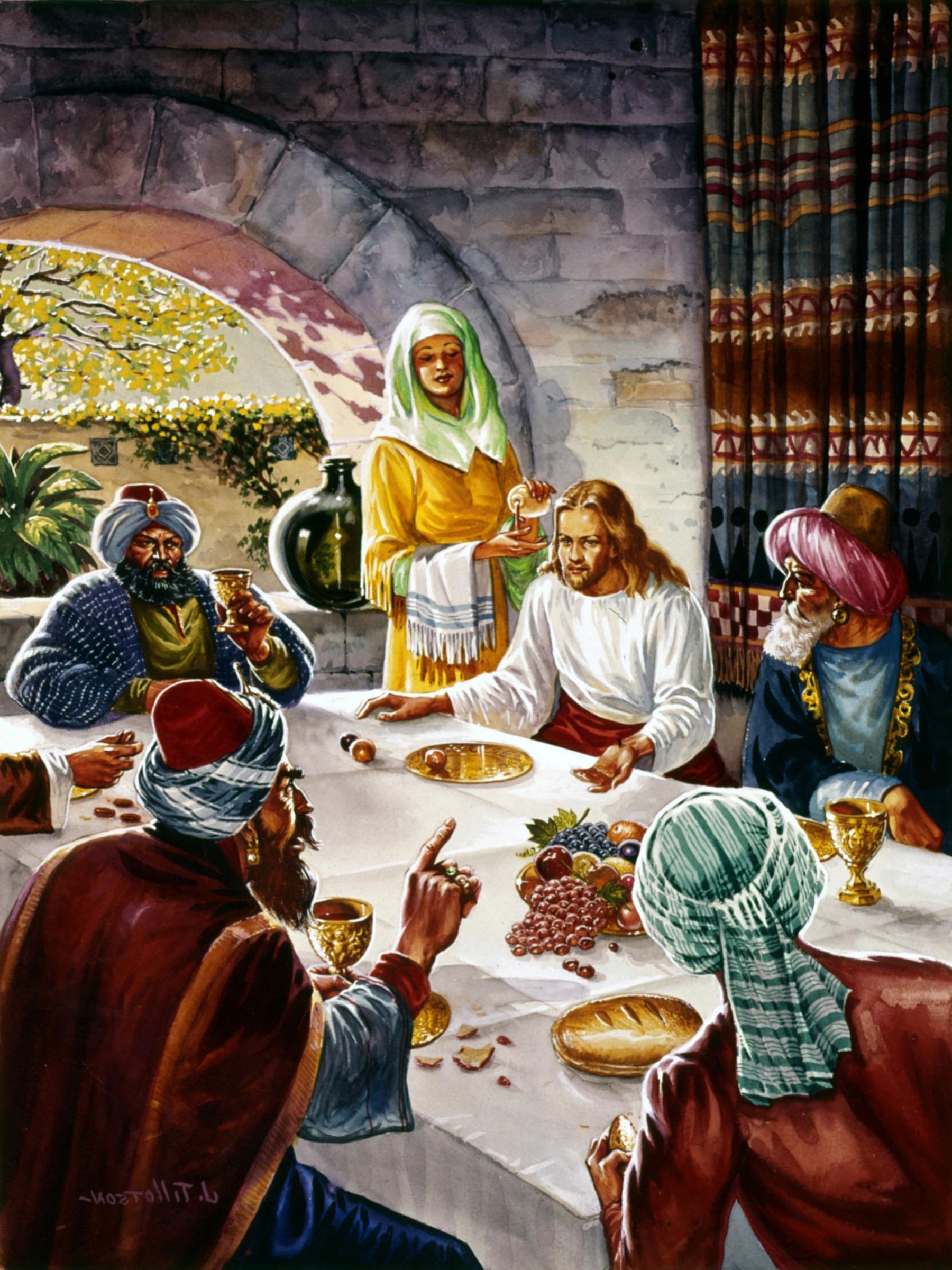 Jesus had dinner with Simon, a Pharisee, but Simon thought bad thoughts about Jesus because a woman with a bad reputation washed Jesus' feet with her tears (Luke 7:36-50).