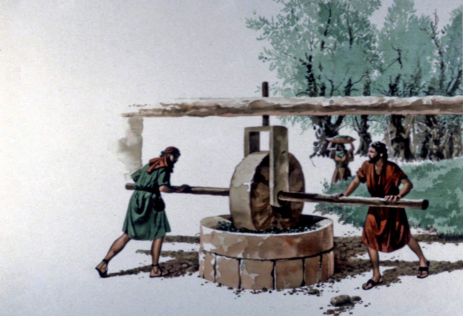 Olive ![]() The olive press seen here used a large rolling stone to crush the olives and release the olive oil into a vat below. It was powered by humans or animals, one on each side, turning the stone, attached to a long pole. olive; olive oil; olive press; stone; rolling stone; vat; olives; olive oils; stones; vats Bible Hub |