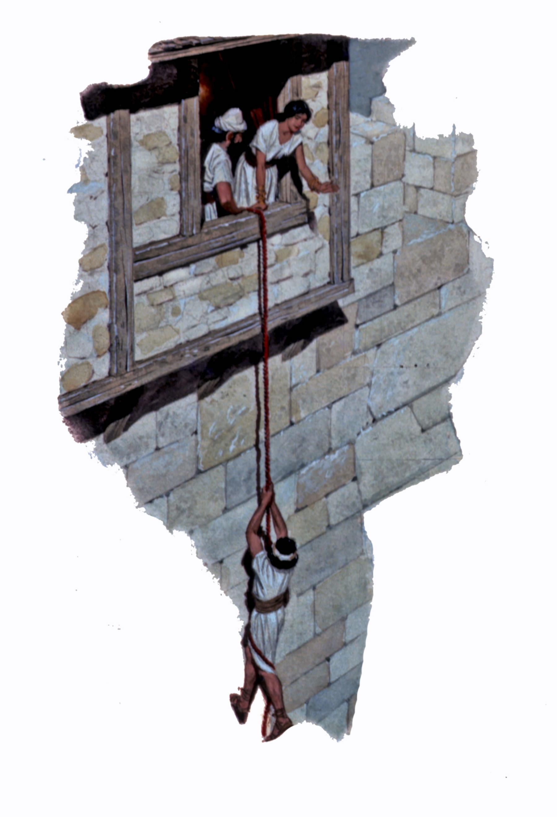 With her scarlet rope  With her scarlet rope, Rahab let the Israelite spies down from her window so they could escape from Jericho (Joshua 2). rahab; Joshua 2; scarlet rope; scarlet; rope; spy; israelites; window; jericho; ropes; spies; windows