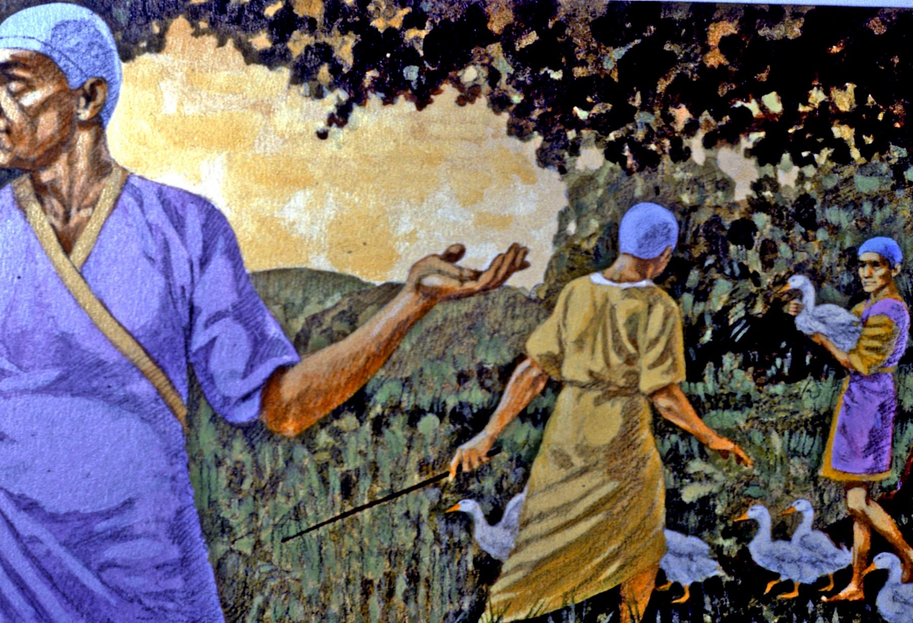 This painting brings to life a Canaanite ivory carving, showing Canaanites with their ducks and geese.