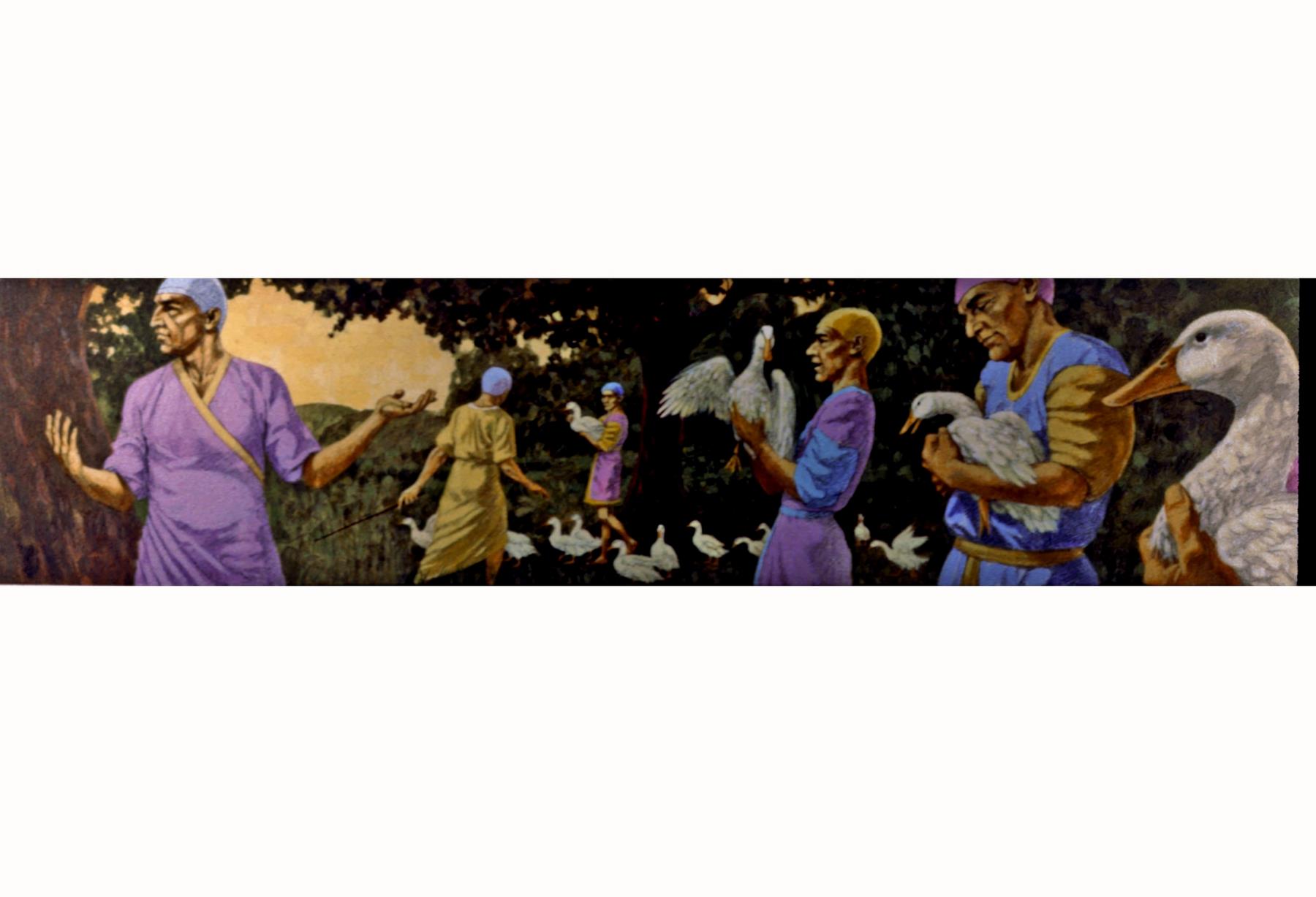 This painting brings to life a Canaanite ivory carving, showing Canaanites with their ducks and geese.