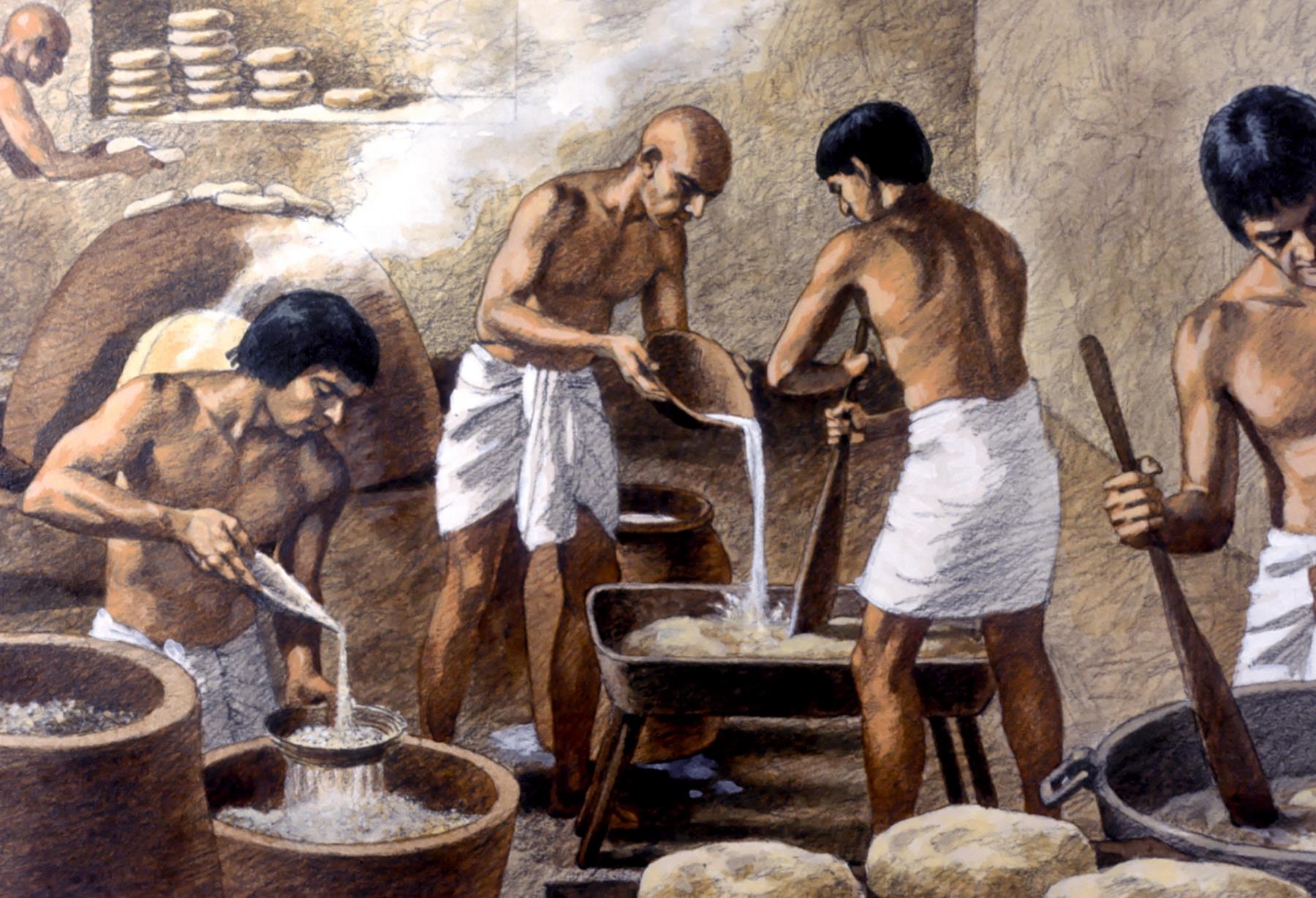 This painting is made from authentic scenes in Egyptian tomb paintings from Old Testament times. It shows bakers in the various stages of making bread.