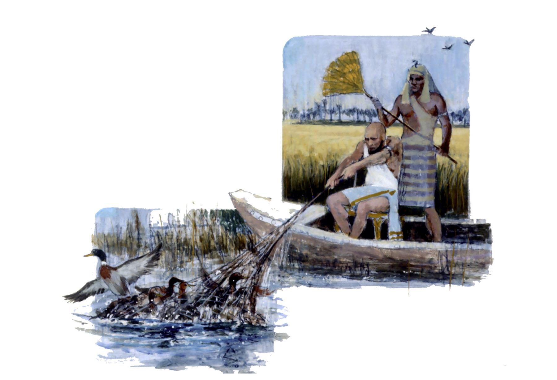 With a signal from his assistant, an Egyptian prince yanks shut the ropes of a clapnet filled with birds.