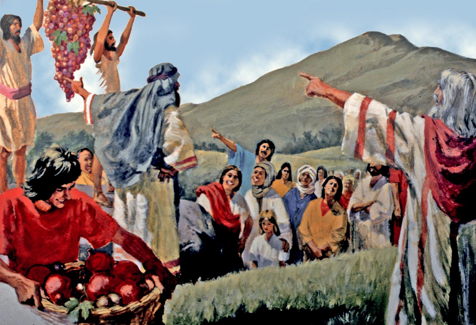 Moses sent twelve spies into Canaan to see what it was like. Ten gave a bad report of the danger, while Joshua and Caleb gave a good report. Here the spies bring a giant bunch of grapes so large that two men must carry it (Numbers 13).