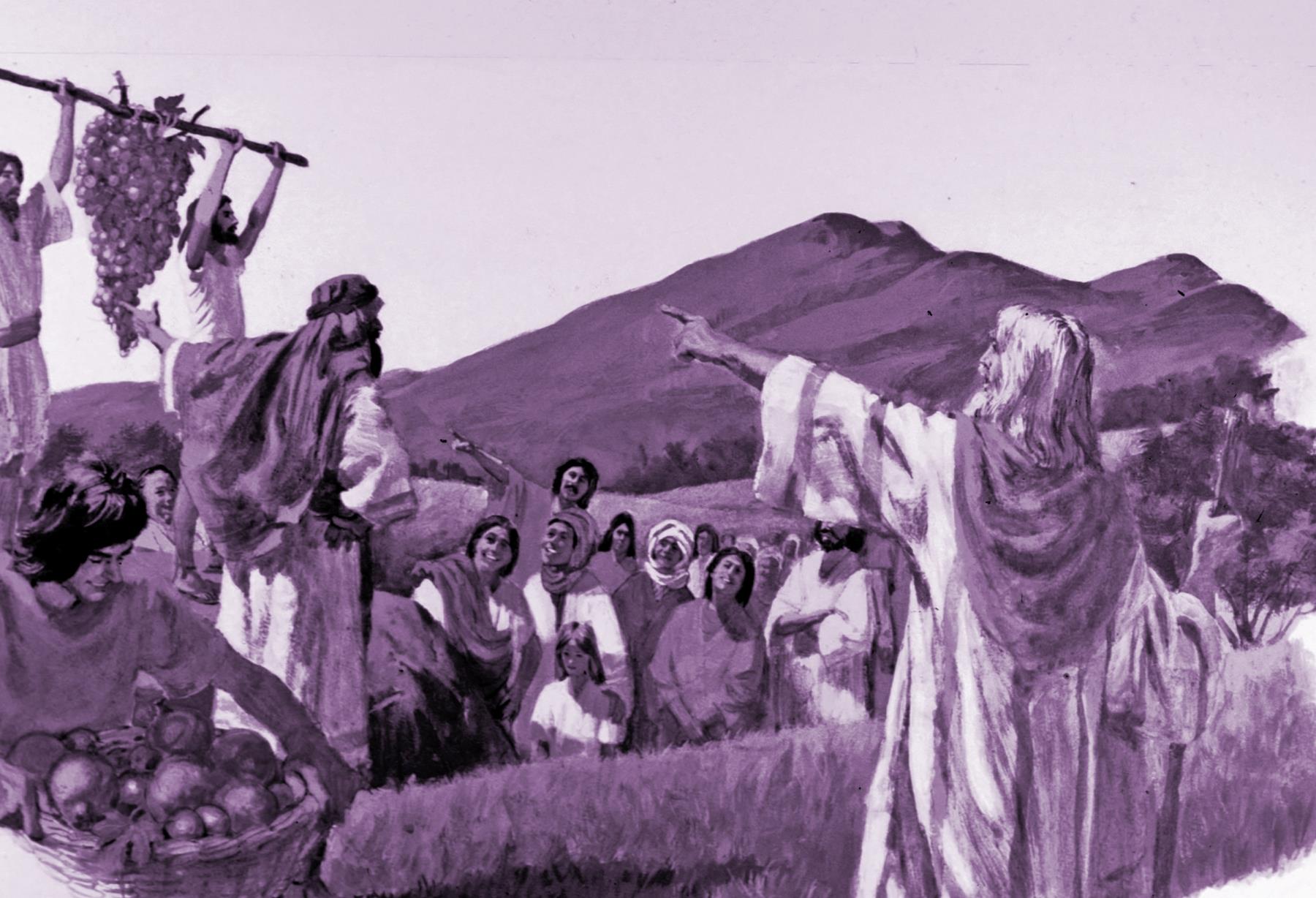 Moses sent twelve spies into Canaan to see what it was like. Ten gave a bad report of the danger, while Joshua and Caleb gave a good report. Here the spies bring a giant bunch of grapes so large that two men must carry it (Numbers 13).