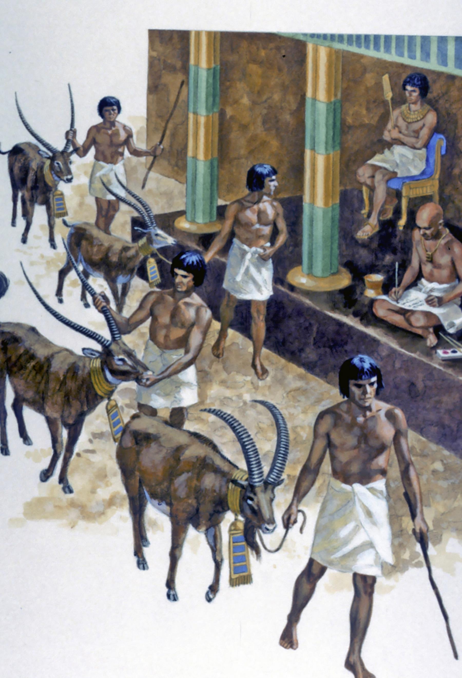 This painting brings to life an ancient Egyptian tomb painting of Egyptians with their animals, presenting them as tomb offerings.