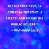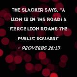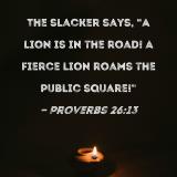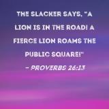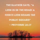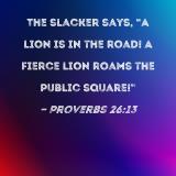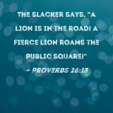 The slacker says, "A lion is in the road! A fierce lion roams the public square!"