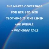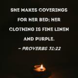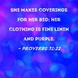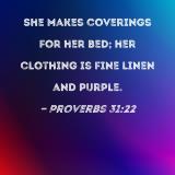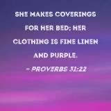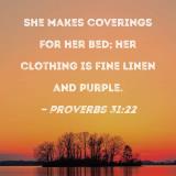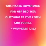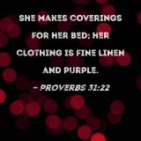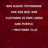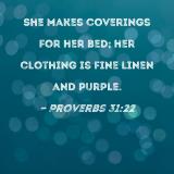 She makes coverings for her bed; her clothing is fine linen and purple.