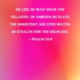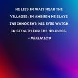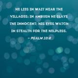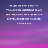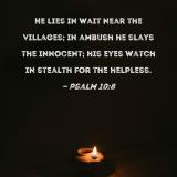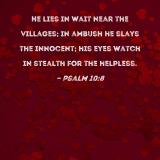 He lies in wait near the villages; in ambush he slays the innocent; his eyes watch in stealth for the helpless.