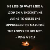 He lies in wait like a lion in a thicket; he lurks to seize the oppressed; he catches the lowly in his net.