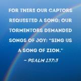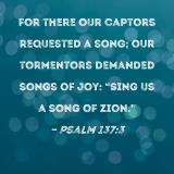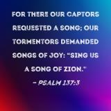 for there our captors requested a song; our tormentors demanded songs of joy: "Sing us a song of Zion."