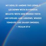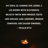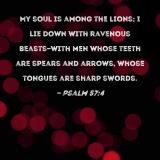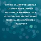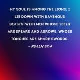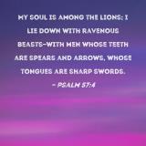 My soul is among the lions; I lie down with ravenous beasts--with men whose teeth are spears and arrows, whose tongues are sharp swords.