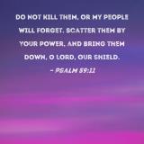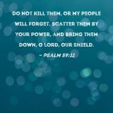 Do not kill them, or my people will forget. Scatter them by Your power, and bring them down, O Lord, our shield.