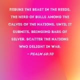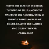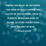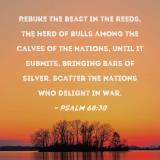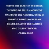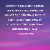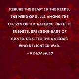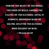 Rebuke the beast in the reeds, the herd of bulls among the calves of the nations, until it submits, bringing bars of silver. Scatter the nations who delight in war.