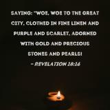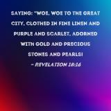 saying: "Woe, woe to the great city, clothed in fine linen and purple and scarlet, adorned with gold and precious stones and pearls!