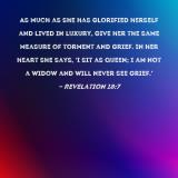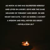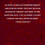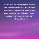 As much as she has glorified herself and lived in luxury, give her the same measure of torment and grief. In her heart she says, 'I sit as queen; I am not a widow and will never see grief.'