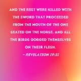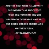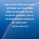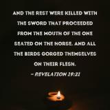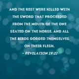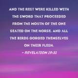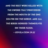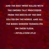 And the rest were killed with the sword that proceeded from the mouth of the One seated on the horse. And all the birds gorged themselves on their flesh.