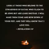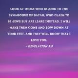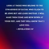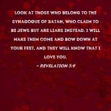 Look at those who belong to the synagogue of Satan, who claim to be Jews but are liars instead. I will make them come and bow down at your feet, and they will know that I love you.