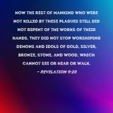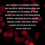 Pictures and Artwork Now the rest of mankind who were not killed by these plagues still did not repent of the works of their hands. They did not stop worshiping demons and idols of gold, silver, bronze, stone, and wood, which cannot see or hear or walk. |