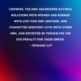 Likewise, the men abandoned natural relations with women and burned with lust for one another. Men committed indecent acts with other men, and received in themselves the due penalty for their error.