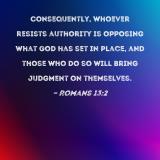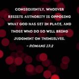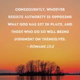 Consequently, whoever resists authority is opposing what God has set in place, and those who do so will bring judgment on themselves.