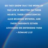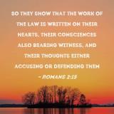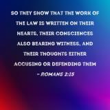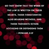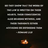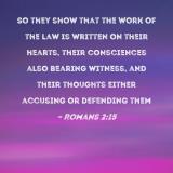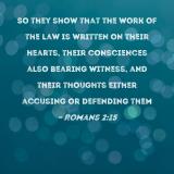 So they show that the work of the law is written on their hearts, their consciences also bearing witness, and their thoughts either accusing or defending them