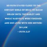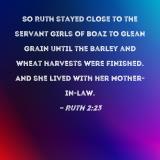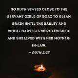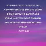 So Ruth stayed close to the servant girls of Boaz to glean grain until the barley and wheat harvests were finished. And she lived with her mother-in-law.